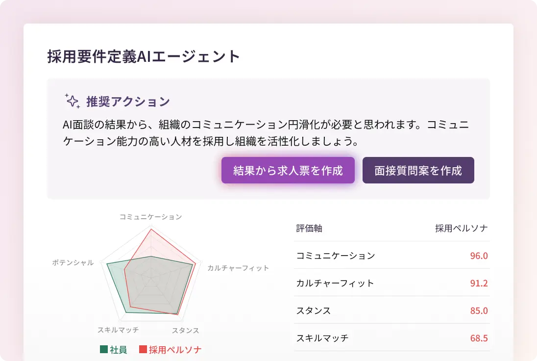 求人票から質問と評価項目を自動生成し、求める人物像を的確に見極める選考を実現。