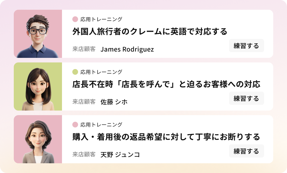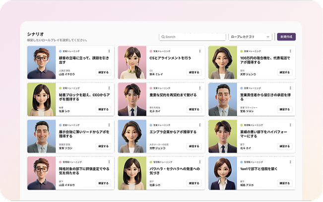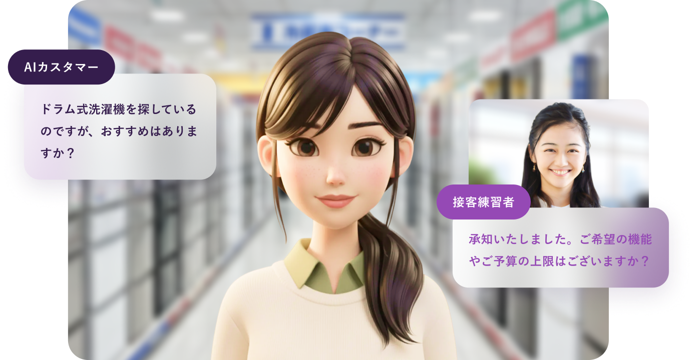 時間や場所を問わず、実践的な接客ロープレが可能。スマホ/PCでいつでも繰り返し演習できるため、接客スキルの早期習得と定着を実現可能です。