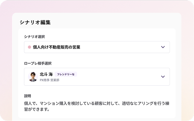 クレーム対応やカスハラ対応など、マニュアルはあっても演習が⾏いづらいシーンも かんたんにシナリオ設定が可能。相⼿の性 格など、より詳細の設定も可能です。