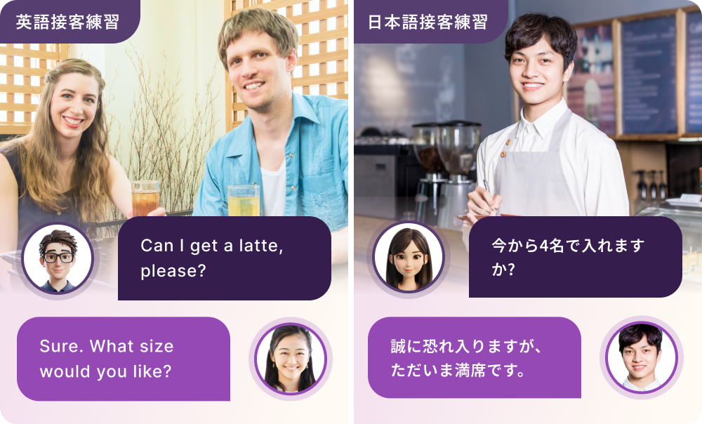 英語でのプレゼンテーション練習、外国の方の日本語での接客練習、言語能力評価など対応しています。