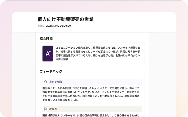 また、ロープレ後の「即時フィードバック機能」や本番の商談やプレゼン映像をアップして評価できる「本番振り返り機能」など、評価の質の高さもサービスが選ばれる理由になっています。