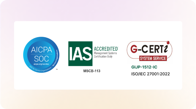 国際標準の情報セキュリティマネジメントシステム認証である「 ISMS認証」に加え、セキュリティ信頼性の指標として国際的に広く利用されている「SOC2 Type1保証報告書」を取得しております。当サービスのセキュリティ体制が国際的な規準に基づき適切・有効に設計・運用されていることの裏付けとなります。