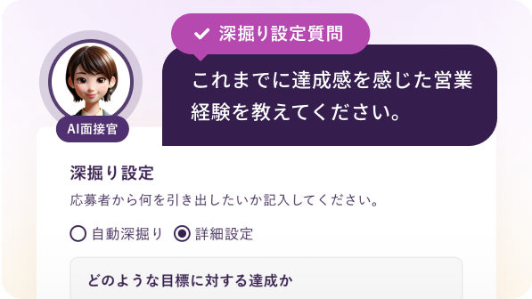 深掘り設計企業が質問の“意図/背景”を設定でき、それに応じて深掘り質問を生成。これにより表面的な回答ではなく、企業が見たい本質的な情報を引き出すための質問構成が可能に。選考の透明性と質が飛躍的に高まります。