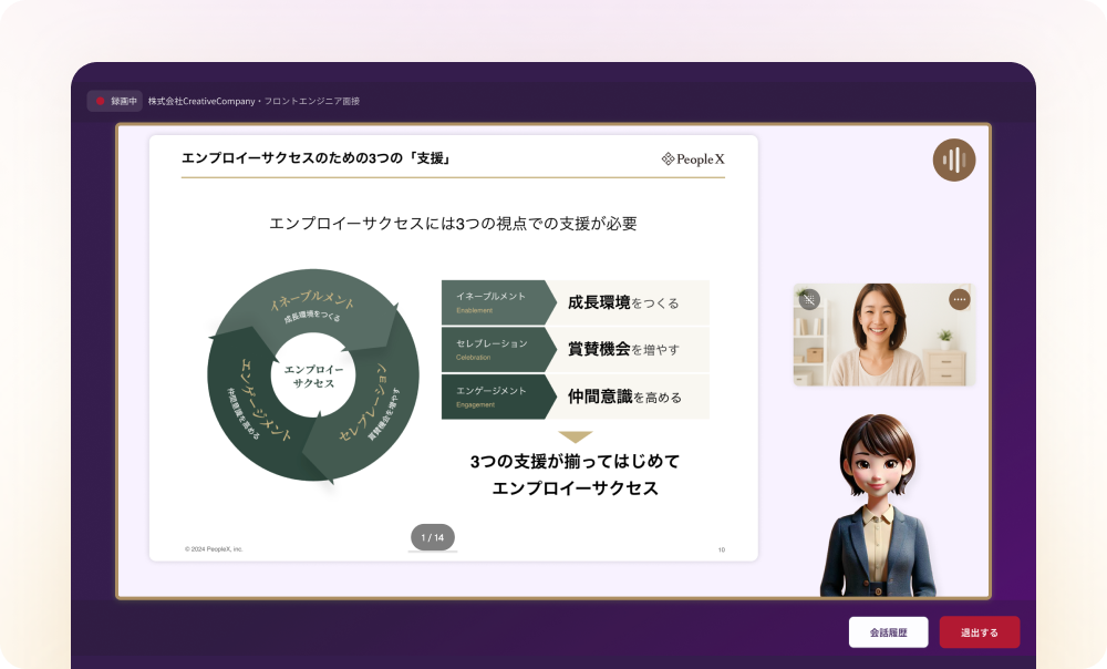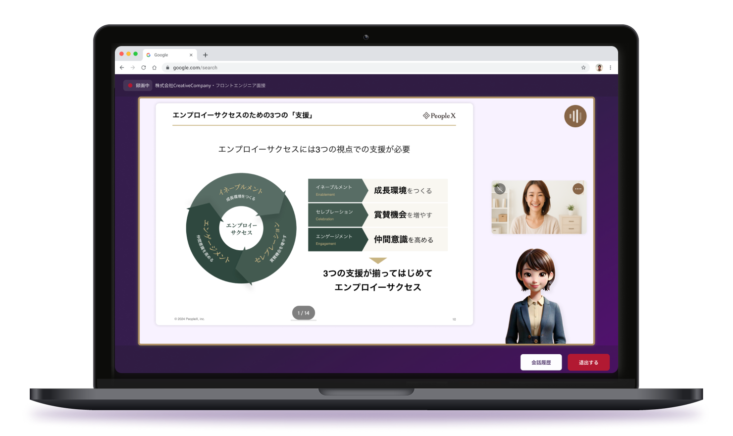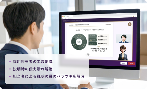 テキストを読むだけではなく、スライド資料を画面に表示しながらAIがナレーションを行います。視覚と聴覚に訴えかけるリッチなコンテンツで候補者を惹きつけ、没入感のある会社説明体験を提供します。