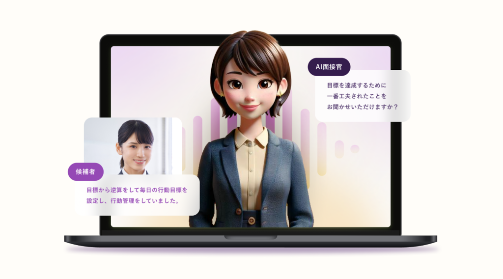 生成AI技術を用いた対話型の面接サービスです。事前に設定した質問だけでなく、回答内容に応じて深掘り質問を行うことが可能なため、レベルの高い面接が実現できます。