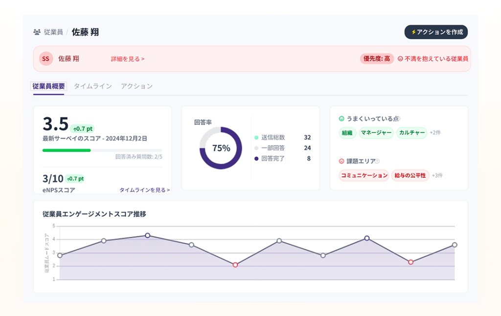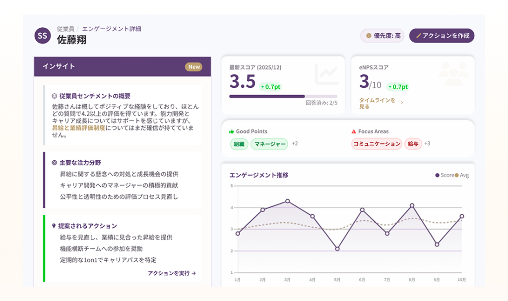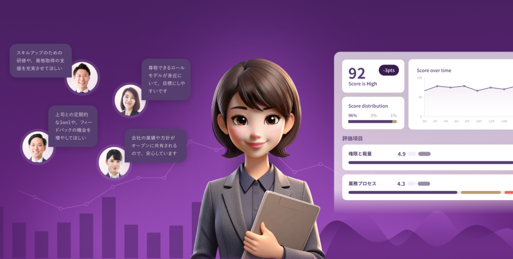 組織全体のデータを等しく分析し、客観的なデータに基づいた意思決定を行えることにより、社員が「自分の声が届いている」「組織が確実に変わっている」という実感を抱き、組織に対する自発的な貢献意欲と信頼が醸成され、エンゲージメント向上と離職防止につながります。
