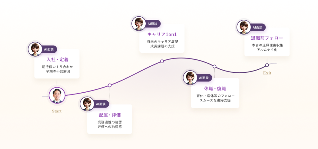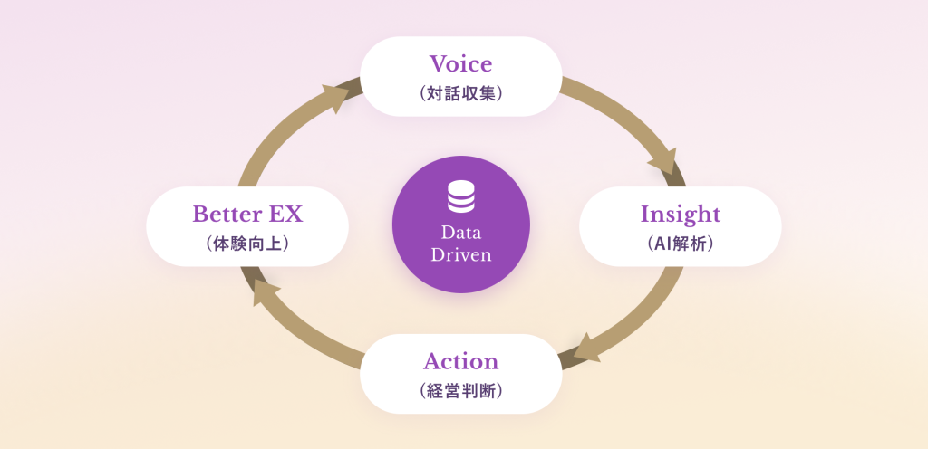 本サービスの面談では、違和感のない自然な音声対話と、相手がAIであることによる率直な自己開示を可能とし、社員の本音を引き出します。さらに、AIが個人・組織の状態を分析し、組織の課題や改善のヒントを可視化します。現場の声がより直接的に施策や改善に結びつきやすくなり、社員にその実感が生まれることで、エンゲージメント向上と組織力強化の好循環を実現します。