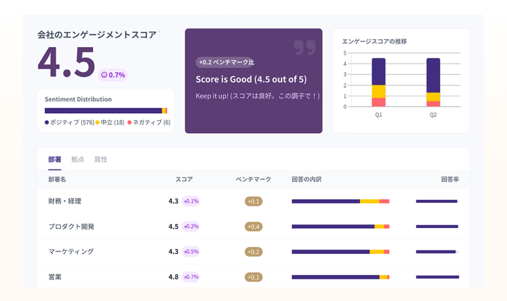 また、組織横断でのスコア比較・分析も、集計に時間を要することなくリアルタイムで行えるため、施策の実行から効果の検証までをスピーディに行うことが可能です。