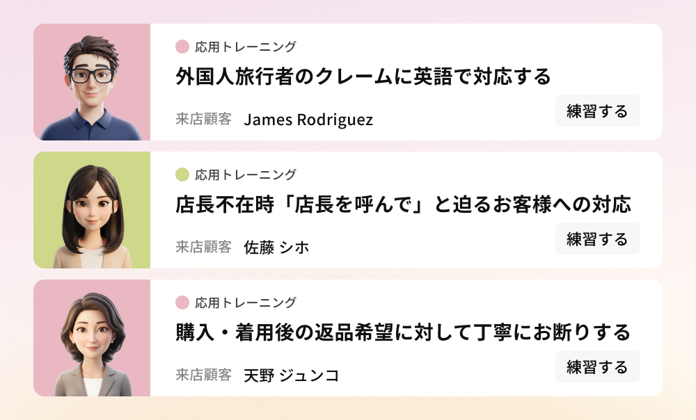 顧客の性格設定に加え、クレーム対応やカスタマーハラスメント(カスハラ)対策など、対面では練習しにくい困難な場面も、AI相手であることで、心理的ハードルを下げて繰り返しシミュレーションできます。