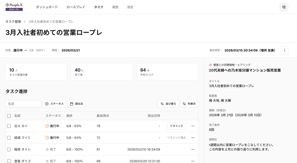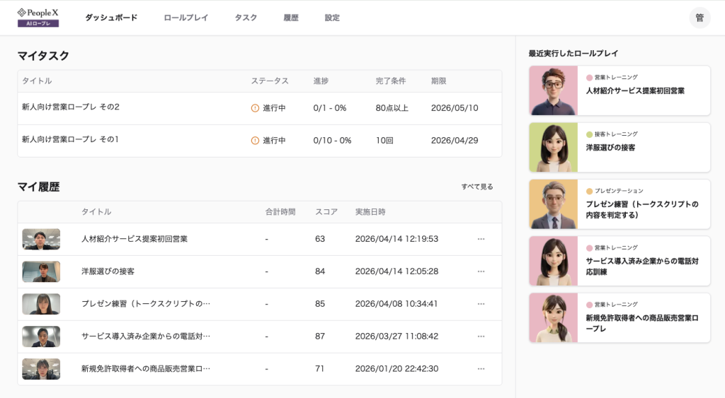 採用から活躍支援まで、AIで人事課題を解決する株式会社PeopleX(本社:東京都新宿区、代表取締役CEO:橘 大地、以下:当社)は、当社が提供する対話型AIロープレサービス「PeopleX AIロープレ」について、新たに学習管理システム(LMS)機能の提供を開始したことをお知らせいたします。本機能は、個々のロールプレイングを社員ごとにタスクとして割り当て、進捗や履歴を一元管理することができるものです。これにより、管理職の負担を大幅に軽減しながら、社員一人ひとりの能力を効果的に向上させる環境づくりを支援します。